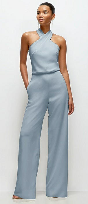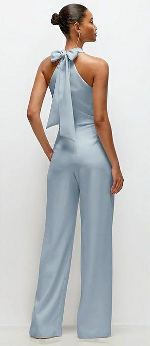 Pleated Halter Blouson Crepe Wedding Jumpsuit with Self-Tie Bow Back in mist