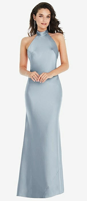 Criss Cross Halter Open-Back Stretch Satin Mermaid Dress in mist