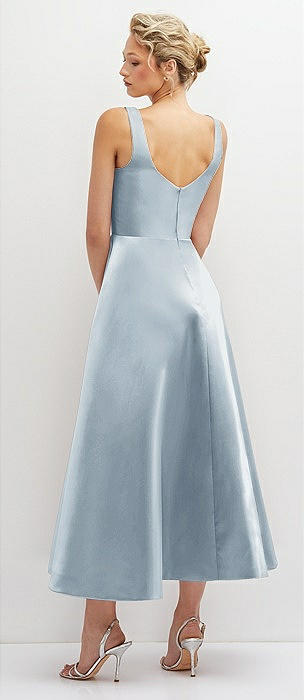 Square Neck Satin Midi Dress with Full Skirt & Pockets in mist