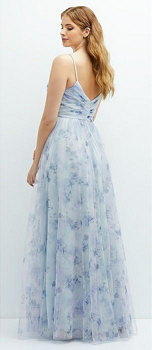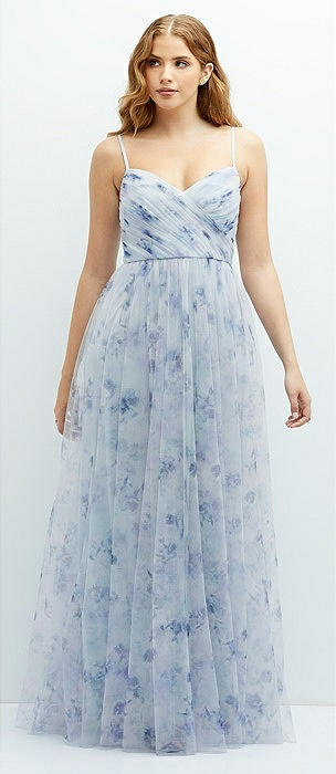 Floral Ruched Wrap Bodice Tulle Dress with Long Full Skirt in mist garden