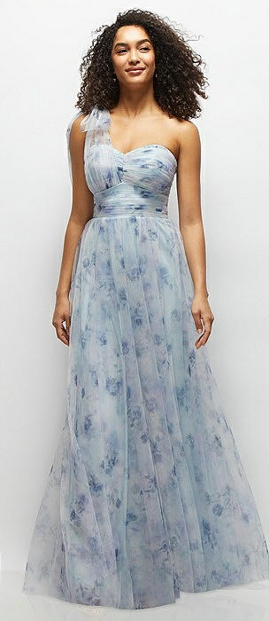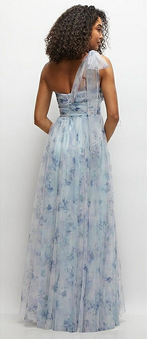 Floral Scarf Tie One-Shoulder Tulle Dress with Long Full Skirt in mist garden