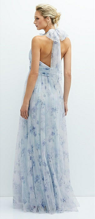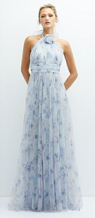 Floral Tie-Back Halter Tulle Dress with Long Full Skirt & Rosette Detail in mist garden
