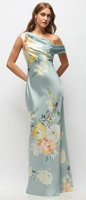 One-Shoulder Draped Bodice Painterly Floral Stretch Satin Column Maxi Dress in mist multi