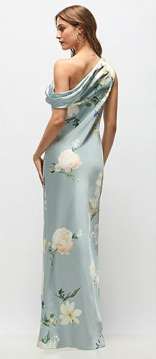 Draped One-Shoulder Bias Painterly Floral Stretch Satin Maxi Dress in mist multi