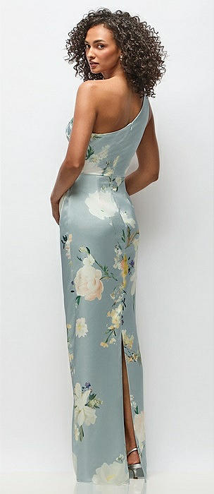 One-Shoulder Draped Bodice Painterly Floral Stretch Satin Column Maxi Dress in mist multi