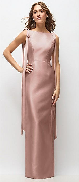 Bateau Neck Satin Column Maxi Dress with Exaggerated Tail Bow Straps in neu nude