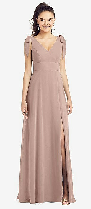 Plunge Neckline Bow Shoulder Empire Waist Chiffon Maxi Dress in neu nude