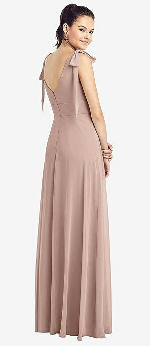 Bow-Shoulder V-Back Chiffon Gown with Front Slit in neu nude