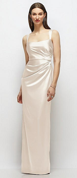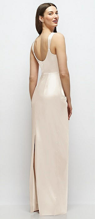 Scoop Neck Draped Column Stretch Satin Maxi Dress in oat