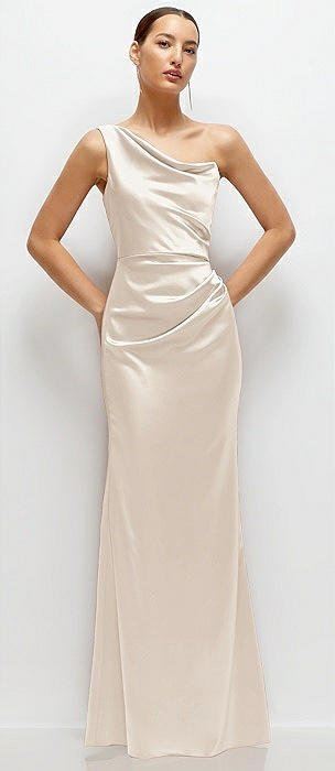 One-Shoulder Cat-Eye Neckline Fit and Flare Satin Maxi Dress in oat