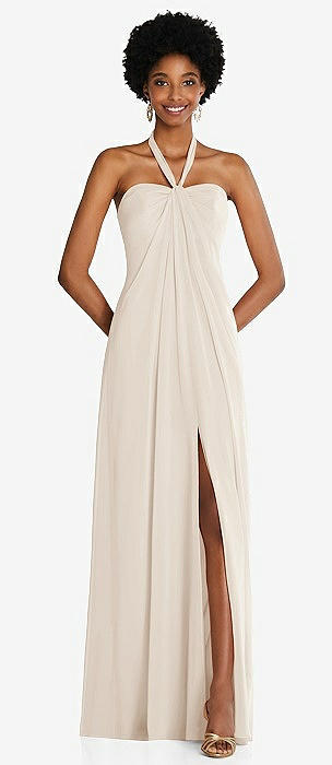 Stand Collar Halter Maxi Dress with Criss Cross Open-Back in oat