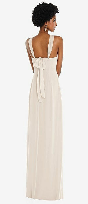 Off-the-Shoulder Criss Cross Back Trumpet Gown in oat