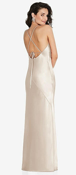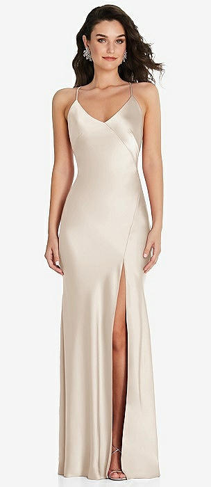 V-Neck Convertible Strap Bias Slip Dress with Front Slit in oat