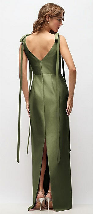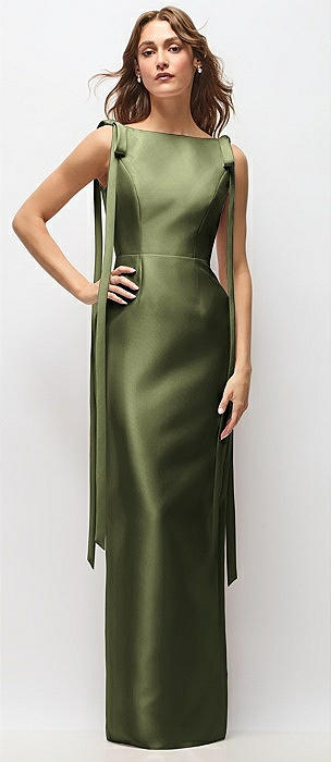 Bateau Neck Satin Column Maxi Dress with Exaggerated Tail Bow Straps in olive green