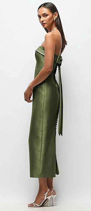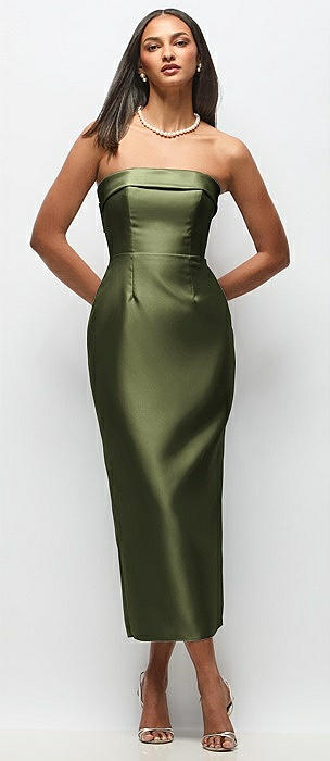 Strapless Cuff Satin Midi Dress with Column Skirt & Back Bow in olive green