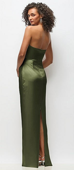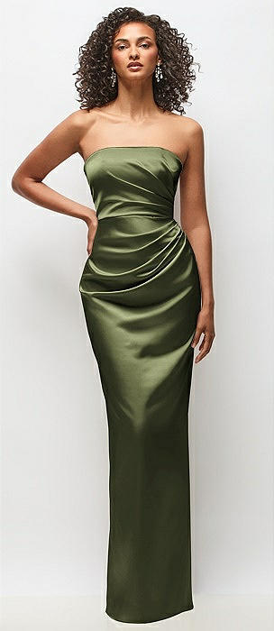 Strapless Draped Bodice Stretch Satin Column Maxi Dress in olive green