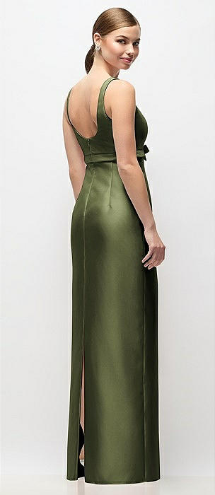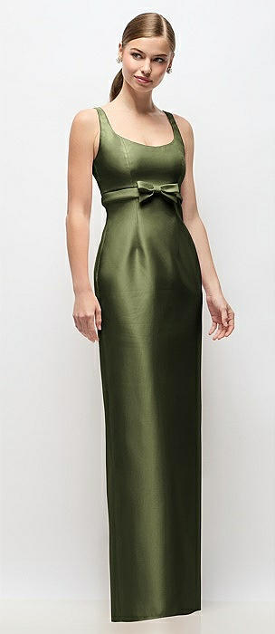 Scoop Neck Satin Column Maxi Dress with Bow at Empire Waist in olive green