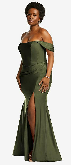 Off-the-Shoulder Corset Stretch Satin Mermaid Dress with Slight Train in olive green