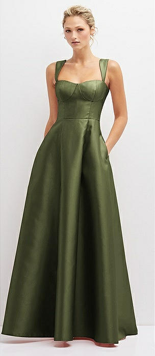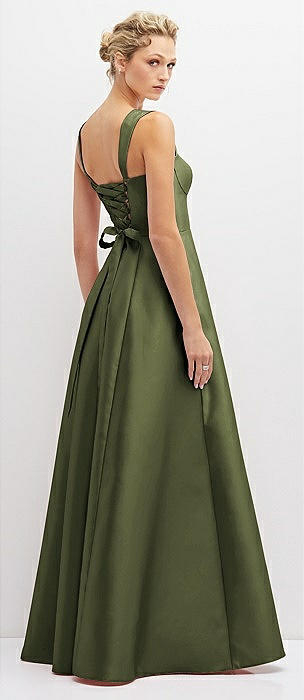 Lace-Up Back Bustier Satin Dress with Full Skirt and Pockets in olive green