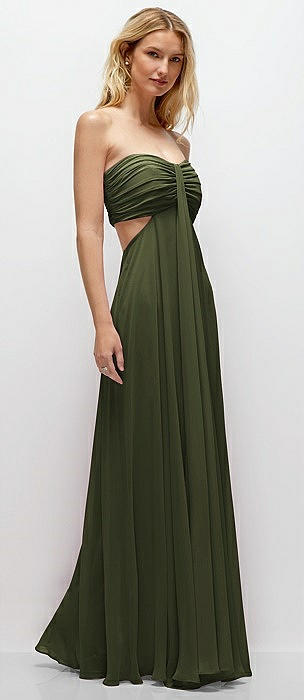 Strapless Empire Waist Cutout Maxi Dress with Covered Button Detail in olive green