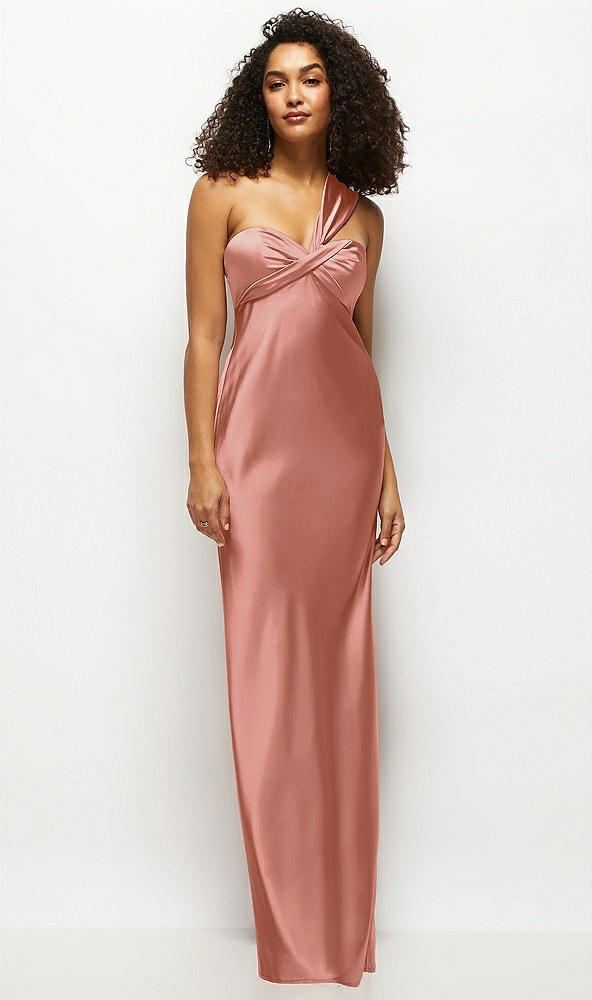 Satin Twist Bandeau One-Shoulder Bias Maxi Dress in Desert Rose