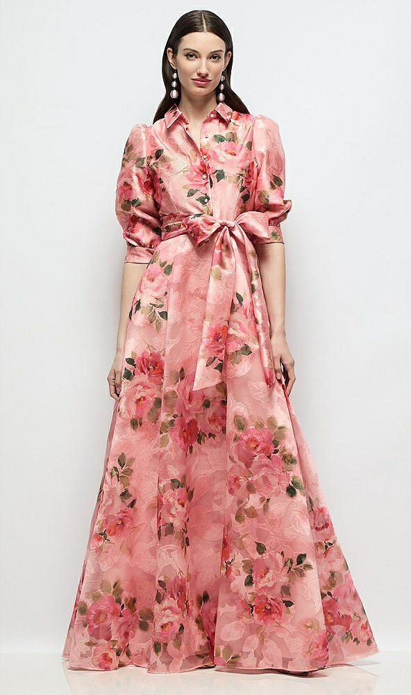 Floral Organza Jacquard Shirt Dress with Full Maxi Skirt & Sash in Guava Floral Print