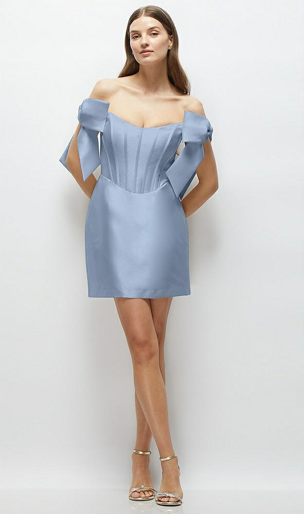 Satin Off-the-Shoulder Bow Corset Fit and Flare Mini Dress in Cloudy
