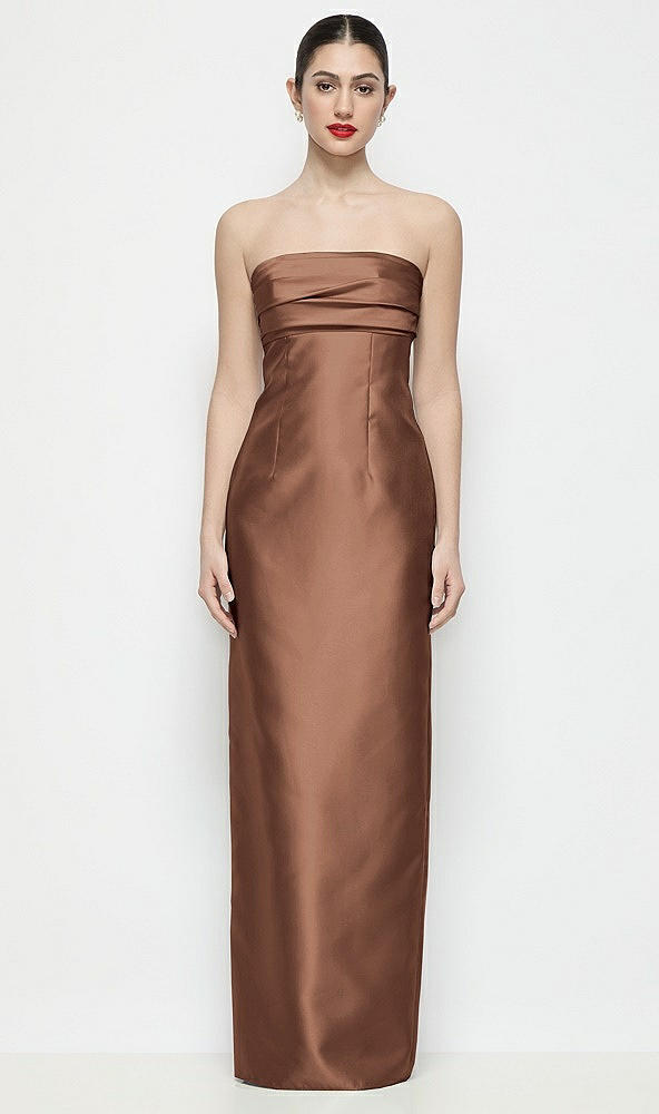 Strapless Pleated Empire Satin Column Maxi Dress in Cognac