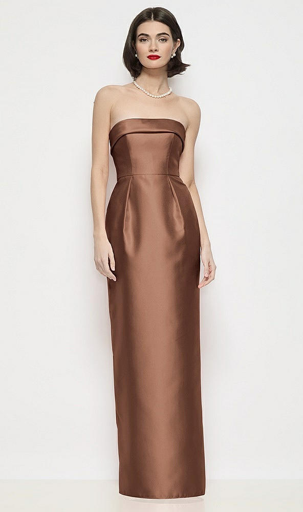 Strapless Cuff Neck Satin Maxi Dress with Column Skirt in Cognac