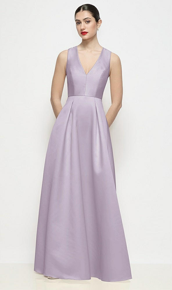 Sleeveless V-neck Satin Maxi Dress with Pleated Skirt in Lilac Haze