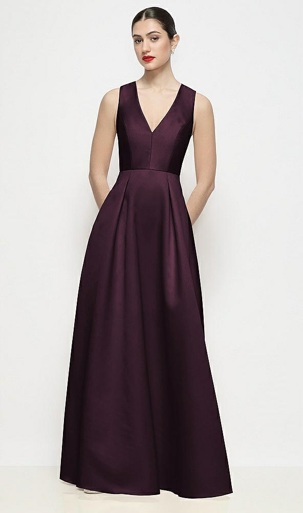 Sleeveless V-neck Satin Maxi Dress with Pleated Skirt in Deep Plum