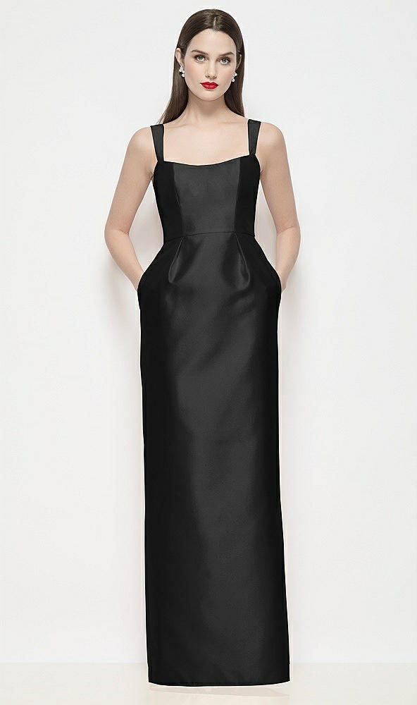 Shaped Strap Basque Neck Satin Maxi Dress with Column Skirt in Black