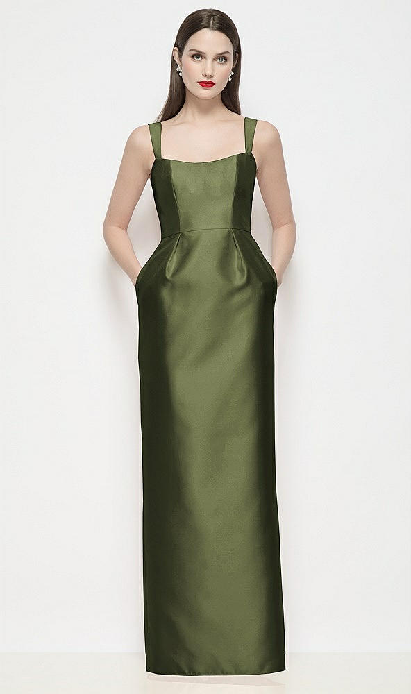 Shaped Strap Basque Neck Satin Maxi Dress with Column Skirt in Olive Green