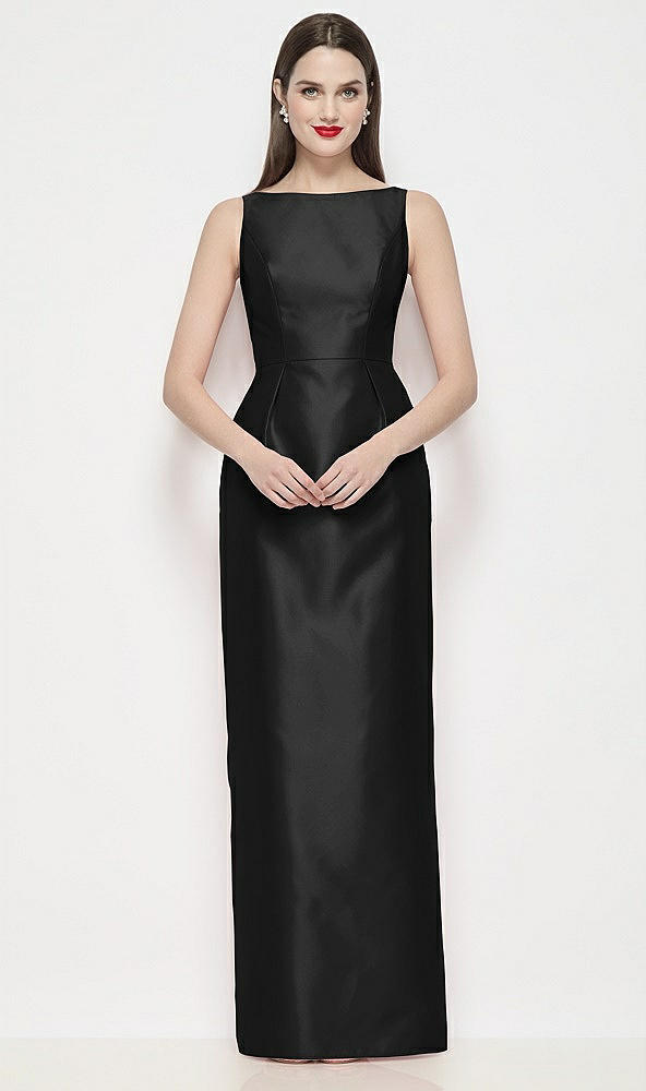 Bateau Neck Satin Maxi Dress with Pleated Column Skirt in Black