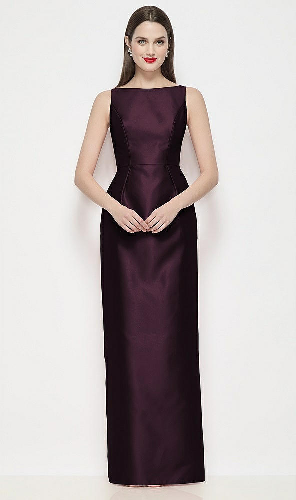 Bateau Neck Satin Maxi Dress with Pleated Column Skirt in Deep Plum