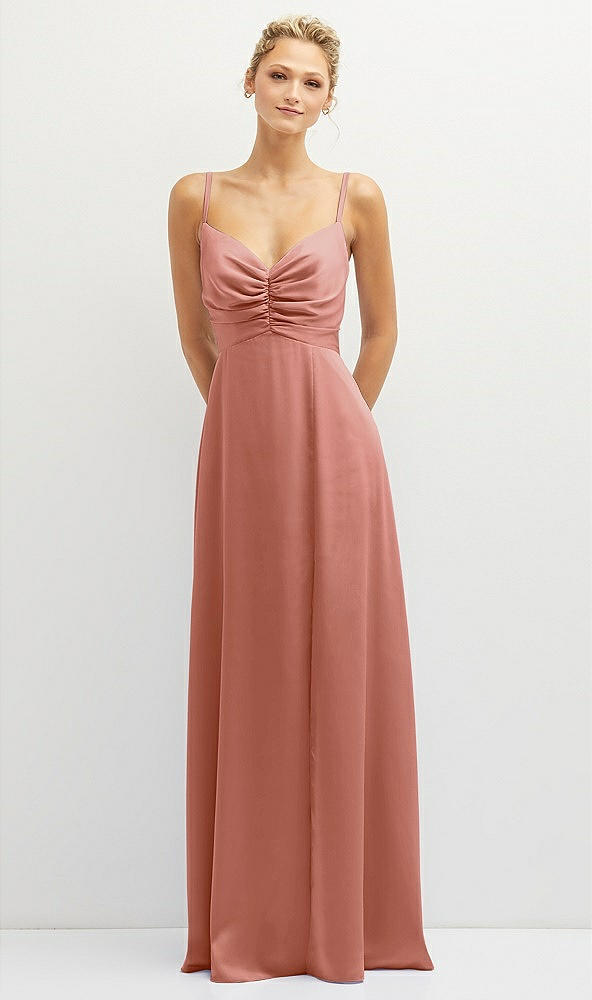 Vertical Ruched Bodice Satin Maxi Dress with Full Skirt in Desert Rose