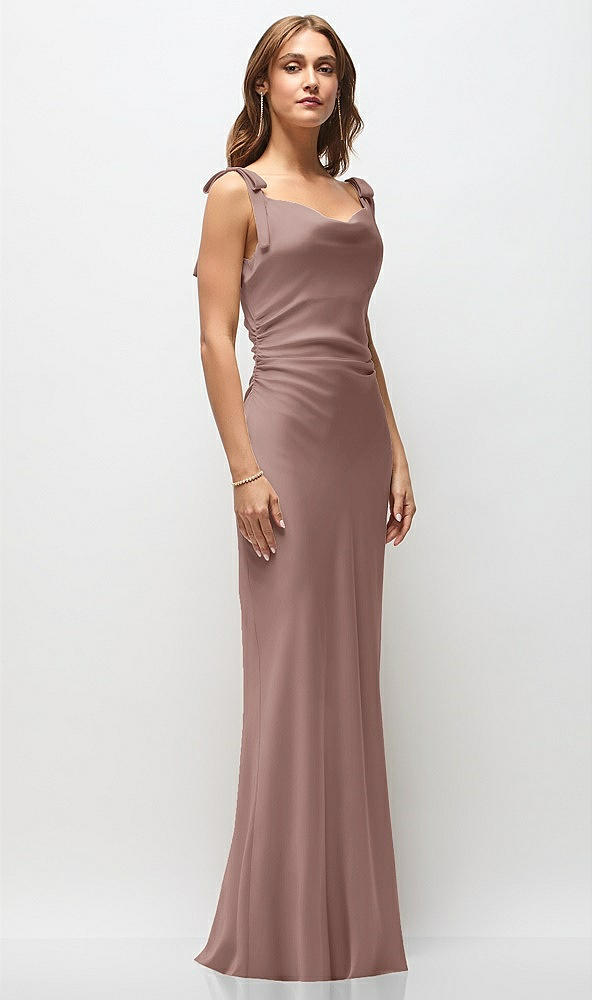 Soft Cowl Neck Ruched Side Satin Bias Maxi Dress with Shoulder Bows in Sienna