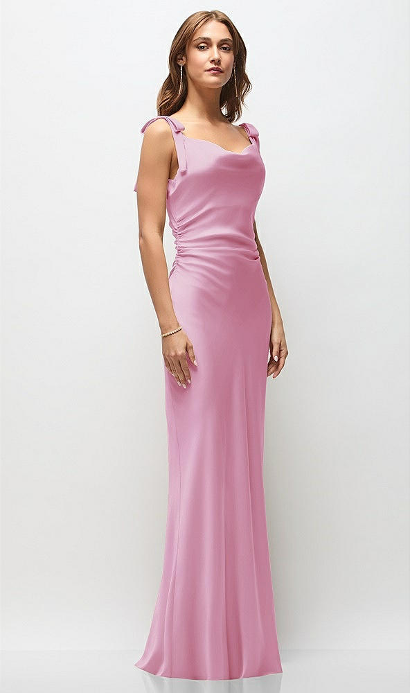 Soft Cowl Neck Ruched Side Satin Bias Maxi Dress with Shoulder Bows in Powder Pink