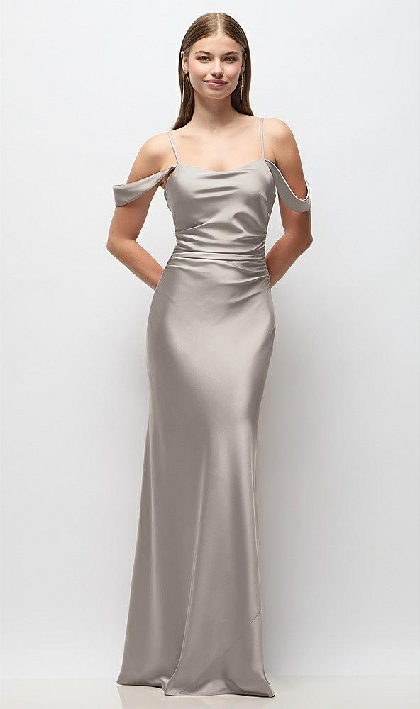 Off-the-Shoulder Swag Ruched Side Satin Bias Maxi Dress with Adjustable Spaghetti Straps in Taupe