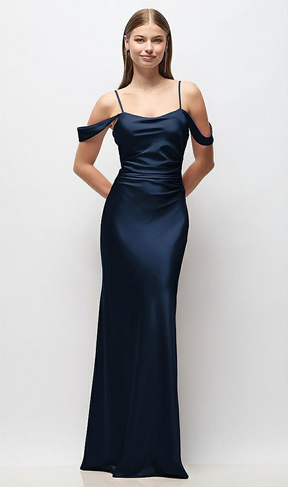 Off-the-Shoulder Swag Ruched Side Satin Bias Maxi Dress with Adjustable Spaghetti Straps in Midnight Navy