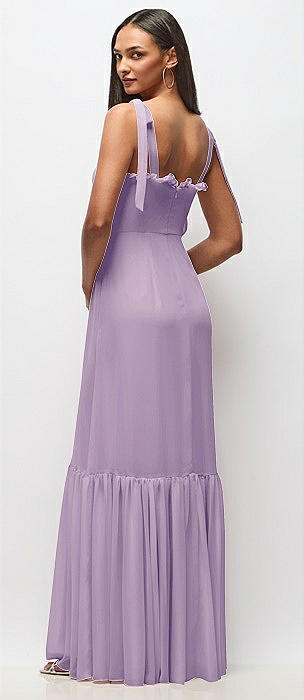 Tie-Shoulder Bustier Bodice Ruffle-Hem Maxi Dress in pale purple