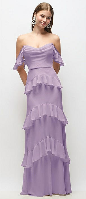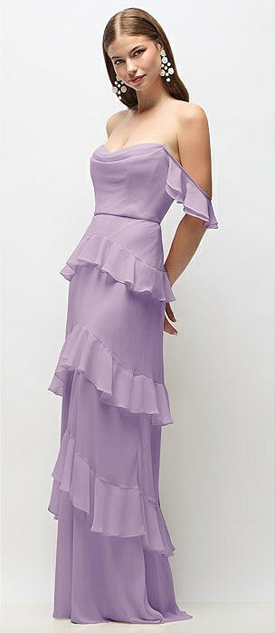 Off-the-Shoulder Cowl Chiffon Tiered Ruffle Maxi Dress with Convertible Ruffle Straps in pale purple