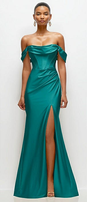 Off-the-Shoulder Corset Stretch Satin Mermaid Dress with Slight Train in peacock teal