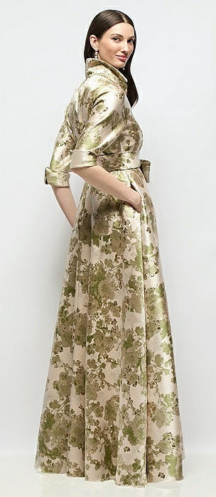Abstract Floral Jacquard Shirt Dress Gown with Sash & Jeweled Buttons in peridot blush