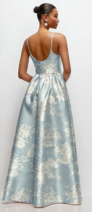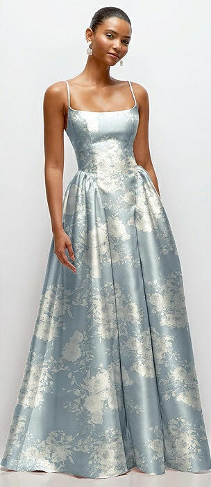 Scoop Neck Drop Basque Skirt Floral Satin Maxi Dress with Pockets in porcelain blue seraphina floral