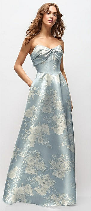 Strapless Floral Satin Column Maxi Dress with Oversized Bow in porcelain blue seraphina floral