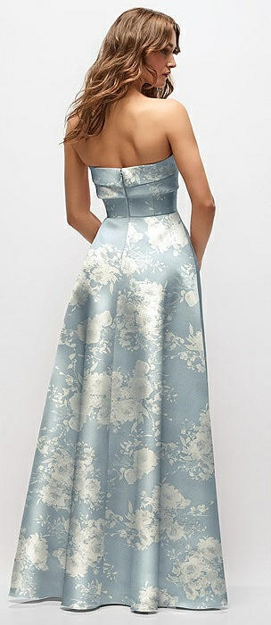 Strapless Floral Satin Gown with Full Skirt and Covered Buttons at Back in porcelain blue seraphina floral