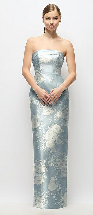 Strapless Floral Satin Column Dress with Removeable Watteau Train in porcelain blue seraphina floral