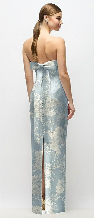 Strapless Cuff Floral Satin Maxi Dress with Column Skirt & Back Bow in porcelain blue seraphina floral