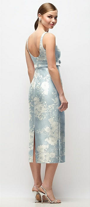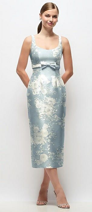 Scoop Neck Floral Satin Column Midi Dress with Bow at Empire Waist in porcelain blue seraphina floral